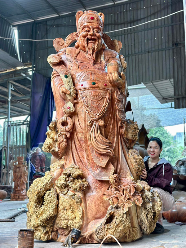 This impressive Prosperity Deity statue represents the traditional image of the Caishen, widely known as the God of Wealth in Asian culture. The statue stands approximately 8.2 ft tall with a base diameter of 3.3 ft, carved from a single block of Chun Sun Cam wood. Depicted standing with a warm smile, the figure symbolizes prosperity, abundance, and positive energy, making it a powerful centerpiece for spiritual and decorative spaces.