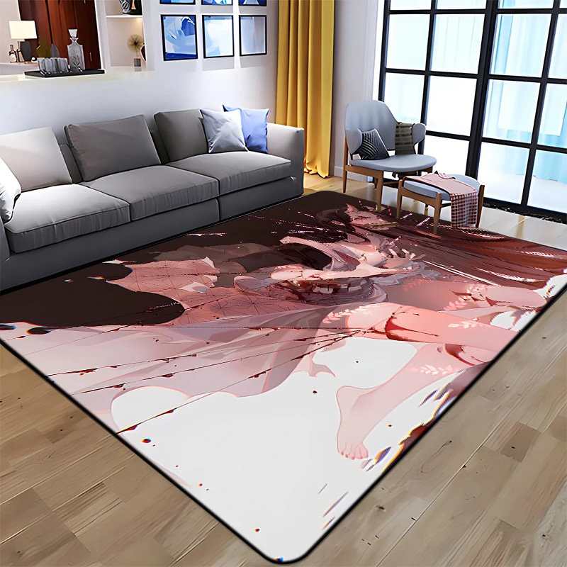 The kamado nezuko demon slayer rug demon slayer carpet bathroom rug indoor rug is designed with 3 layers, flannel composite sponge rug, a middle foam layer, and non-slip plastic dots on the bottom made of non-woven fabric to enhance water absorption. With a thickness of 1.2 cm, it is durable and woven and dyed using advanced technology, resulting in a soft texture.
