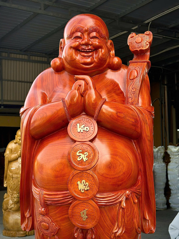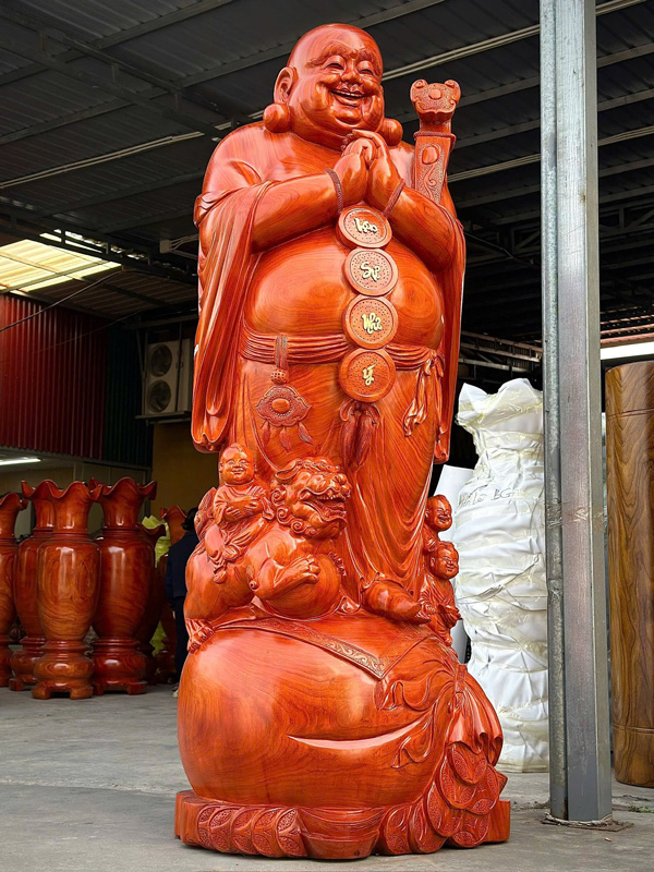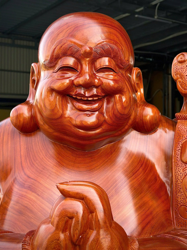 Large Hand-Carved Laughing Buddha Statue – 8.2 ft Solid Padauk Wood
