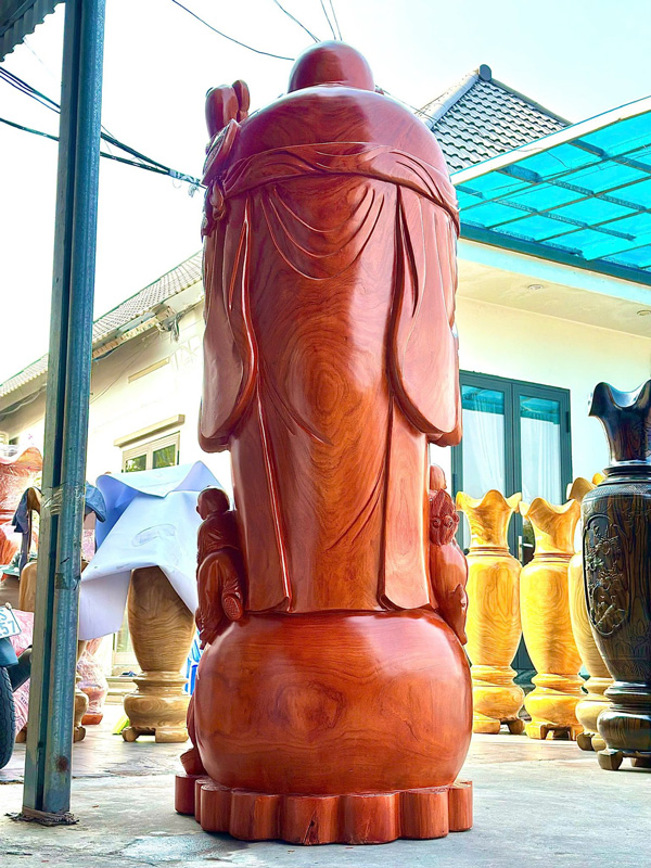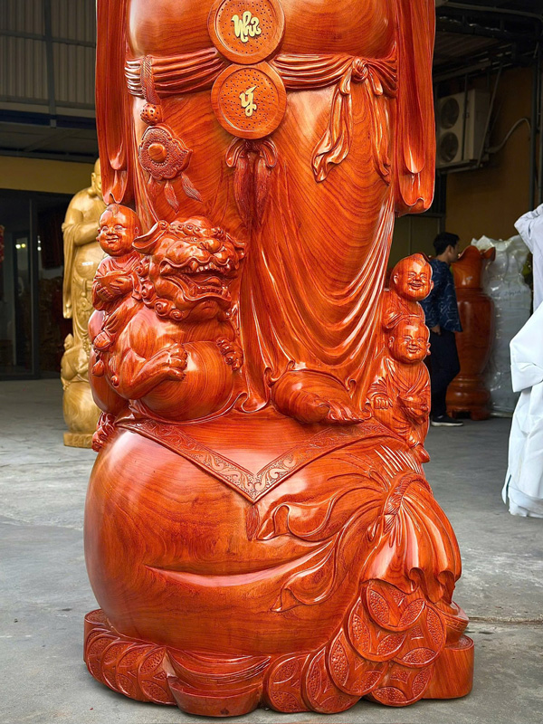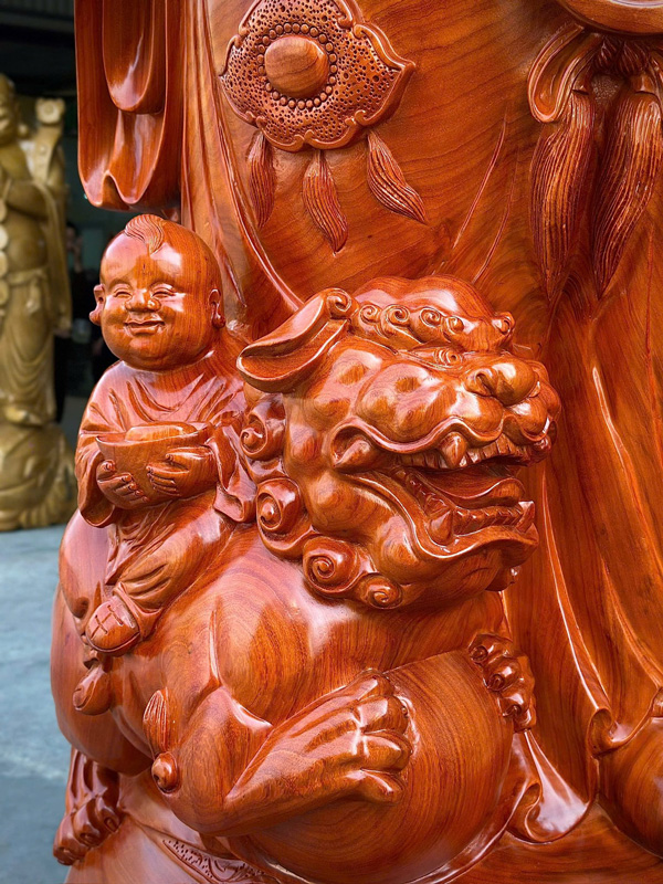 One of the most remarkable features of this piece is the deep reddish tone of aged Padauk wood, a natural color highly valued in traditional wood sculpture. The wood grain is especially vivid across the head, shoulders, back, and legs, creating beautiful natural patterns that enhance the sculpture’s presence. Combined with detailed hand carving and the symbolic imagery, this statue becomes a powerful centerpiece for temples, spiritual spaces, living rooms, or business environments, bringing warmth, prosperity symbolism, and timeless craftsmanship into the space.