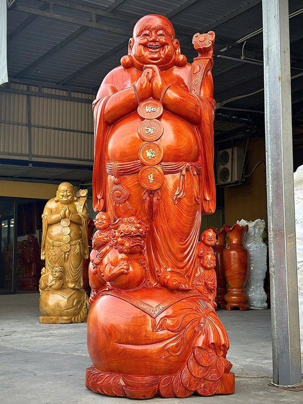This magnificent Laughing Buddha statue is handcrafted from solid Padauk wood, standing approximately 8.2 ft tall with a 2.6 ft diameter. The sculpture depicts Budai with his hands joined in a congratulatory gesture, smiling warmly to symbolize the arrival of prosperity, happiness, and good fortune. The base of the statue is artistically designed with a large money bag and three joyful child holding a gold ingot, representing blessings, wealth, and abundance.
