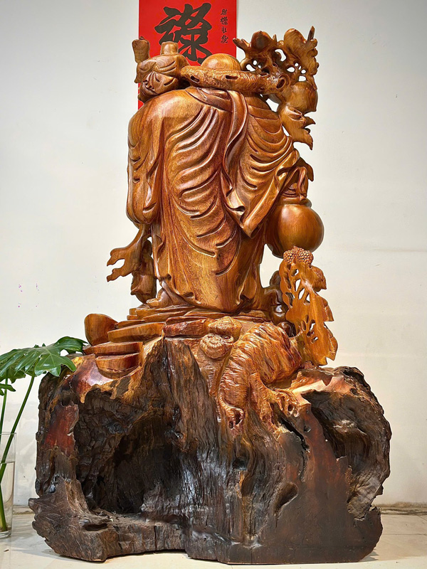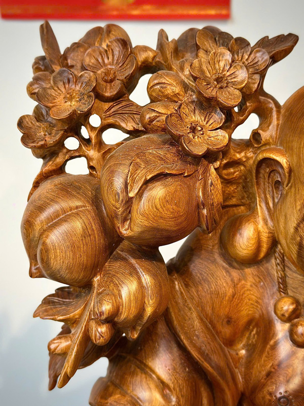 In one hand, the Buddha holds a ruyi scepter, a traditional symbol of authority and fulfilled wishes, while the other carries a cloth bag filled with ancient coins, representing wealth and blessings shared with others. Behind and beside the figure are large longevity peaches, symbols of long life and vitality. At the base of the statue sits a Qilin, believed to protect the home and attract prosperity. With its rich symbolism and fine hand-carved details, this statue makes a meaningful centerpiece for home altars, living rooms, or spiritual spaces.