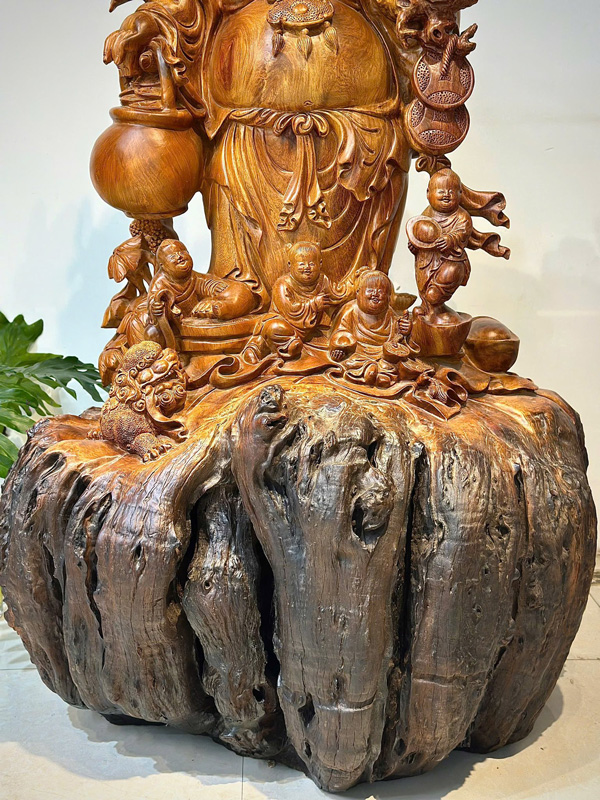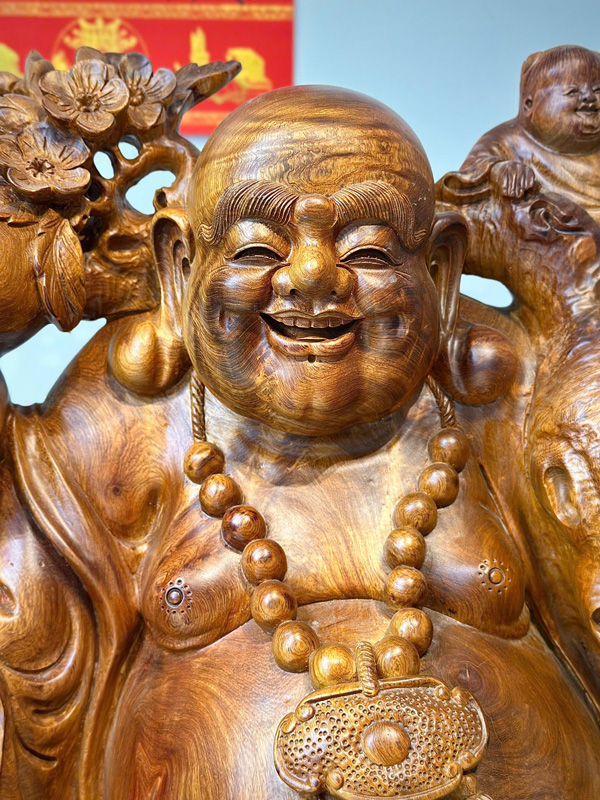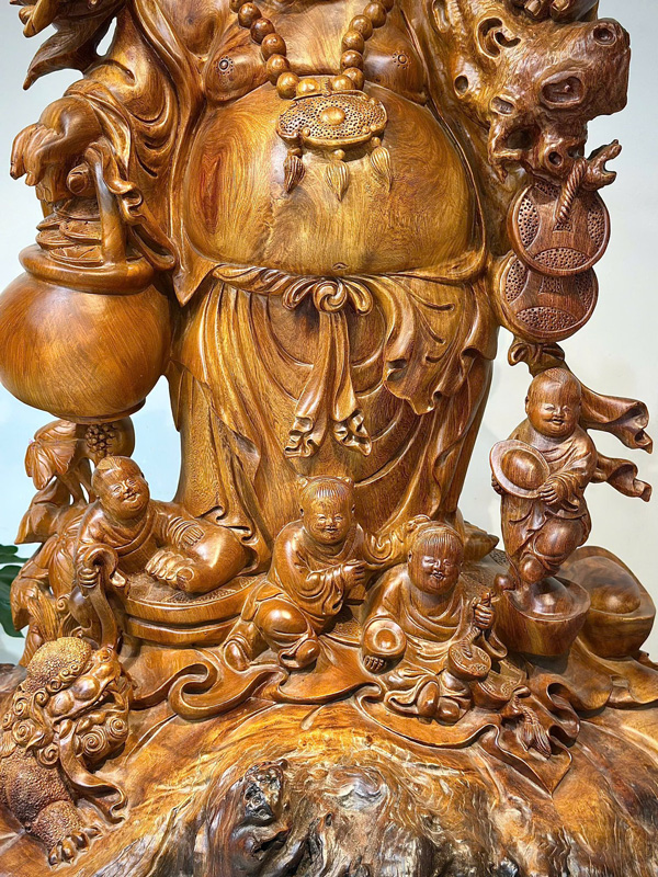 This beautifully crafted Laughing Buddha statue is carved from solid Huong Stone wood, standing approximately 3.3 ft tall with a 2 ft diameter. The sculpture portrays Budai standing with a warm, joyful smile and his iconic large rounded belly, a symbol of happiness, abundance, and generosity. Surrounding the Buddha are five playful children, representing the traditional blessing of “Five Fortunes” – happiness, prosperity, longevity, health, and peace.