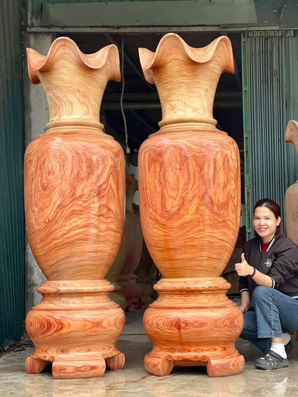 This striking Wooden Feng Shui Vase Pair is handcrafted from solid Padauk wood, carved from a single block of natural hardwood. Each vase stands approximately 5.9 ft tall with a 1.7 ft diameter, creating a bold and elegant decorative presence. The most distinctive feature of this pair is the rare ocean wave–like wood grain, formed naturally in Padauk trees that are over 100 years old. These flowing patterns resemble moving waves, giving the vases a unique artistic character that cannot be replicated.